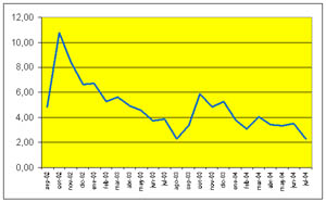 Durante el mes de julio se contrataron 46.716 nuevas líneas Adsl , 23.890 líneas menos que en el mes de junio, lo que supone un total de 2.090.441 instaladas en España. Se ha tardado cinco años desde la publicación en el BOE de marzo de 1.999 del servicio Adsl, en llegar a superar la cifra sicológica de los 2.000.000, de mantenerse el actual ritmo de crecimiento se llegaría a las 3.000.000 de líneas Adsl instaladas en España en diciembre de 2.005. Muy lejos de las previsiones que sitúan en 5.000.000 de líneas a final del año que viene.
